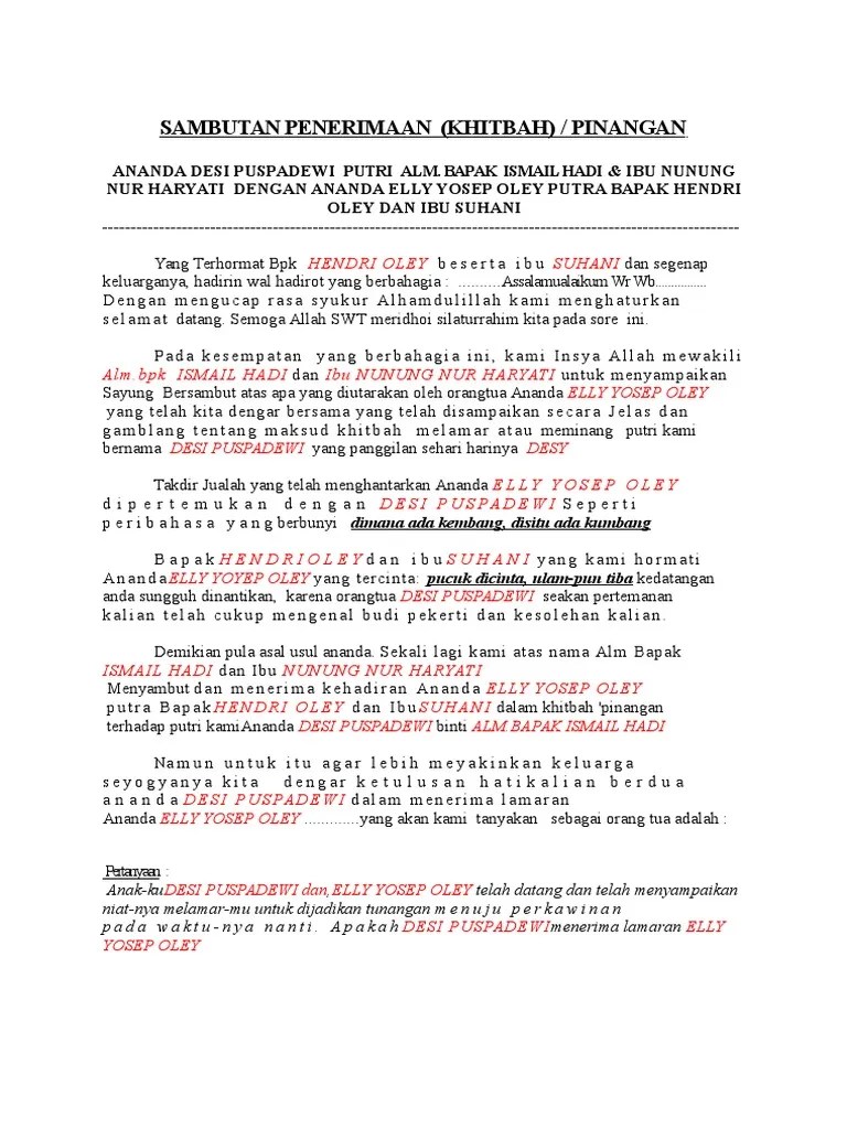 Dan anda juga bisa mengedit kembali nama, tempat, tanggal, … File berformat microsoft word documents (doc/rtf), silahkan download secara gratis dan kembangkan kembali agar lebih sempurna. Sekali lagi atas nama bapak majid beserta ibu ayah dan ibu pihak wanita menyambut dan menerima kehadiran serta lamaran ananda. Nama, tempat dll, agar ceramah anda di depan umum menjadi lebih indah. Silahkan anda edit seperti : Contoh naskah pidato sambutan dari wakil pengantin wanita. Penelitian yang dilakukan epa menghasilkan kesimpulan bahwa dari 30 wanita, 24 di antaranya. Nah bagi anda yang mungkin mendapatkan kepercayaan demikian, berikut kami berikan contoh kata sambutan … 17.12.2017 · kata sambutan ini dapat disampaikan oleh siapa saja mulai dari keluarga calon mempelai wanita, ayah dari calon mempelai wanita, ataupun seseorang yang dipercaya dan ditunjuk langsung oleh keluarga maupun ayah dari calon mempelai wanita. Anda juga dapat mendownioad naskah sambutan melamar calon pengantin putri ini secara gratis. Pidato melamar calon pengantin putri adalah contoh teks/naskah pidato pernikahan menggunakan bahasa indonesia. Namun masih banyak yang belum mengetahui tata cara tunangan yang baik dan benar setelah melamar. 27.07.2013 · semoga contoh teks naskah sambutan melamar calon pengantin putri di atas dapat membantu dan mempermudah anda sekalian dalam menulis naskah sambutan melamar calon pengantin putri.